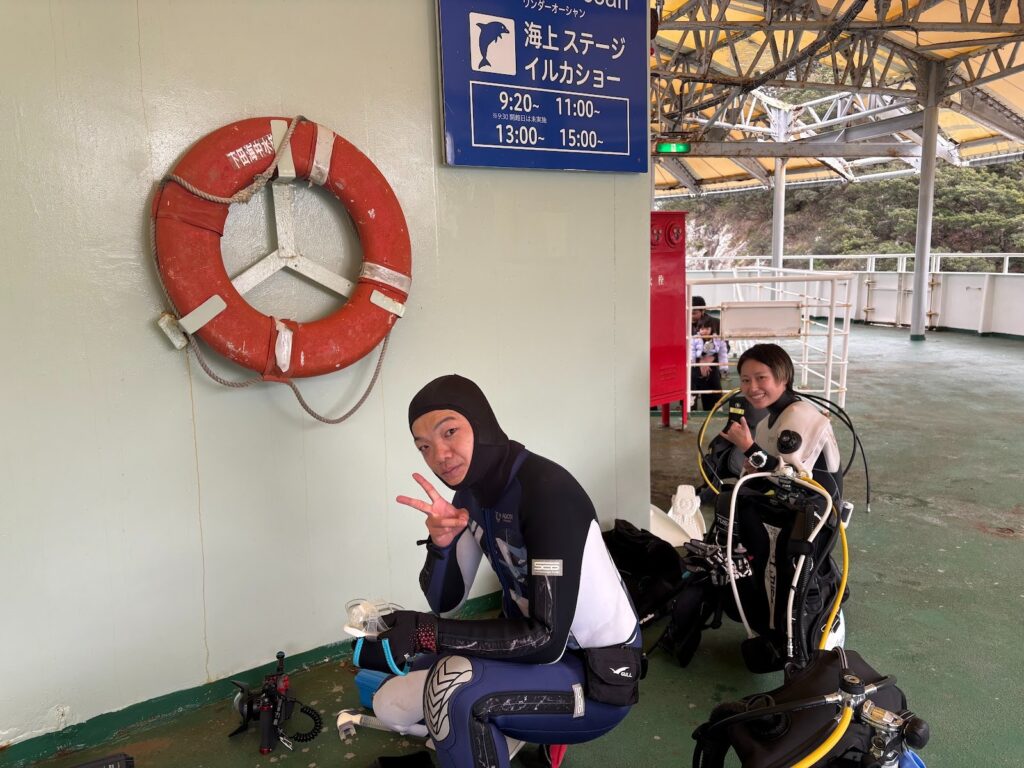 人数には限りがあるので大水槽チームとイルカ水槽チームに分かれてダイビングをしていきます!